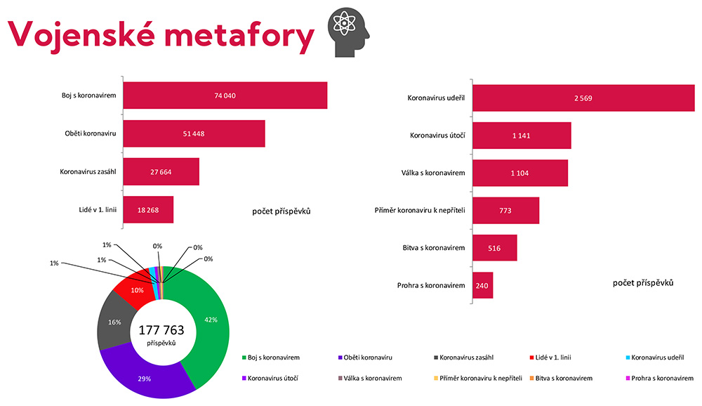 Analýza se zaměřuje na zmapování výskytu deseti vytipovaných výrazů z vojenské terminologie, které se objevují v mediálním prostoru coby metafory v kontextu zvládání pandemie nemoci COVID-19. Celkem bylo v českých médiích v období od ledna do října zaznamenáno téměř 180 tisíc výskytů těchto vojenských metafor.